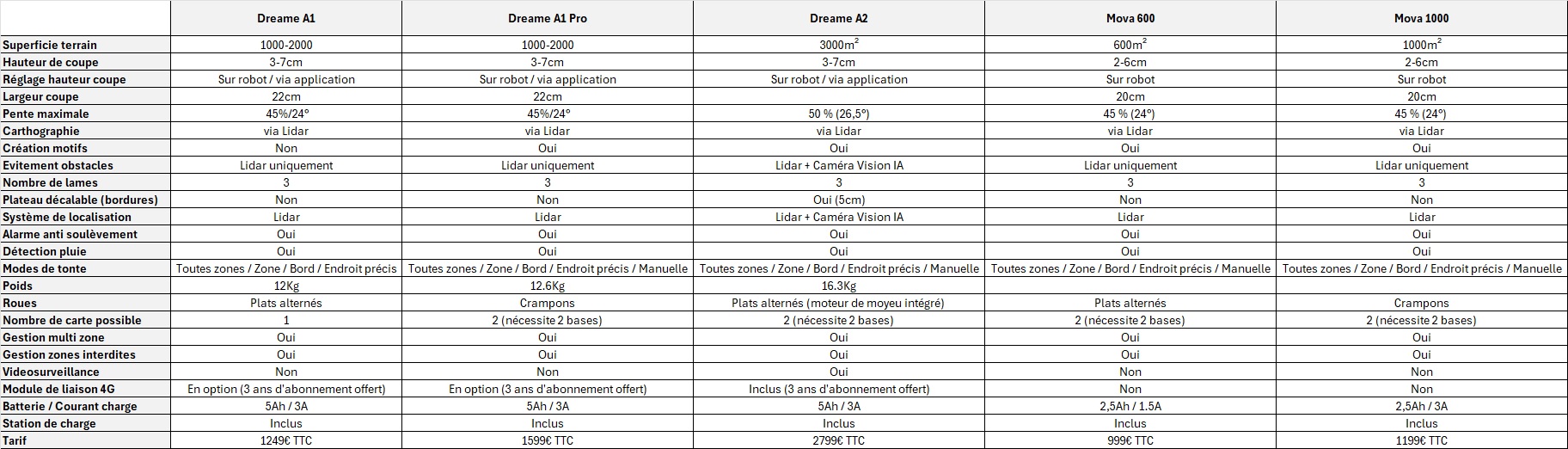 pour ceux que ca intéresse Il y a un tableau comparatif complet sur cette page https://comparatif-robot-tondeuse.fr/